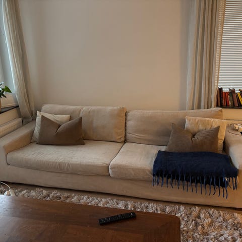 Soffan är cirka 1 år gammal, köpt ny av mig i mio-butik och är i mycket fint skick (nyskick). Den säljs endast på grund av flytt.