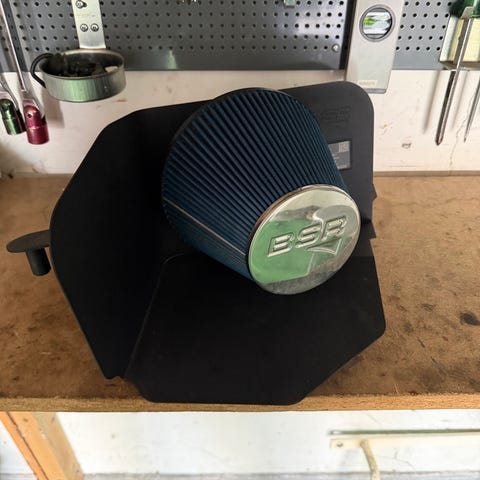 Volvo luftfilter av sporttyp med blått koniskt filterelement. Monterat på en svart skyddsplåt/sköld med fäste för installation i motorrum. Passar som eftermarknads luftintag på utvalda Volvo-modeller där dimensioner och anslutning stämmer. Avsett för användning i personbilens insugssystem. Kontrollera mått och anslutningsdiameter mot aktuell bilmodell innan montering.Bara provmonterat lät för mycket för mig från dumpventil.köpt ny från BSR mars 2026