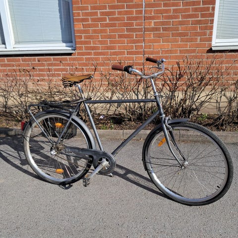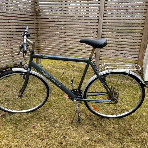 Fullt fungerande och utrustad med skärmar, pakethållare, ramlås, belysning, reflexer och ringklocka samt nästan nya Continental Ride Tour däck.