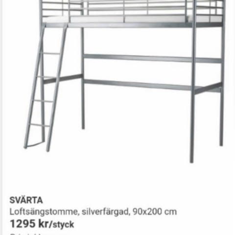 IKEA Svärta loftsäng i grå metall med stege på sidan. Stabil metallram med plats för säng eller skrivbord under. Passar resårmadrass med mått 90x200. Höjd ca 190cm.