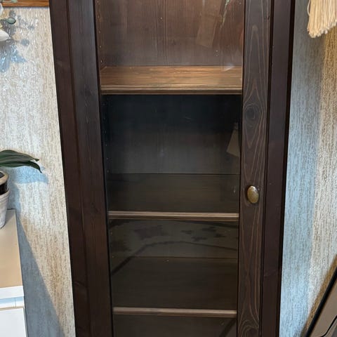 Fint skåpi körsbär säljes. Halva skåpet är vitrin med glasskivor och den lyses upp med LED-belysning. Den andra halvan är skåp med två hyllplan.