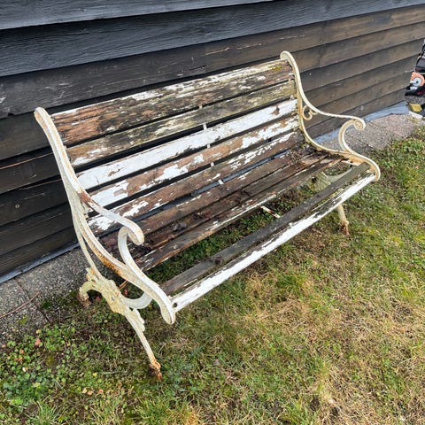 Trädgårdsbänkar i klassisk parkmodell. Sits och rygg består av gråmålade träribbor och sidorna är i svart gjutjärn med dekorativa detaljer. Passar för utomhusbruk på altan, uteplats eller i trädgård. Säljes tillsammans som set enligt bilderna.