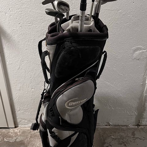 Original pris 2000kr 💰 ❌ Betala 750kr ✅ Wilson ProStaff golfset med bag. Setet innehåller flera klubbor, bland annat woods och järnklubbor, med matchande headcovers. Golfbagen är en ståbag med utfällbara ben, bärremmar och flera fickor för förvaring av bollar, tillbehör och personliga saker. En dragkedja är trasig som jag har tagit bild på. Färgkombinationen är främst svart med blå och grå detaljer. Passar perfekt till alla nybörjare till våren👍