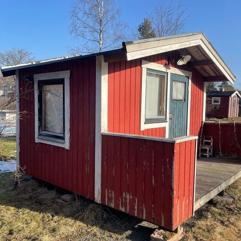 Fristående åttakantigt lusthus i trä med flera fönster och enkel trädörr. Fasaden är klädd med stående träpanel och har ett tak med lätt lutning. Byggnaden står på mark och insidan visar synlig trästomme och rågolv, utan färdig inredning. Passar som enklare trädgårdshus, förråd eller enklare uteplats under tak efter eventuell renovering och anpassning. Price negotiable