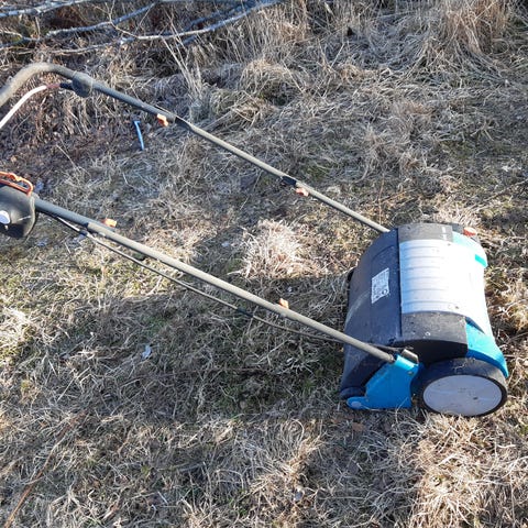 AL-KO Combi Care 38 E elektrisk vertikalskärare för skötsel av gräsmatta. Modellen har en effekt på 1,3 kW och drivs med 230 V, 50 Hz. Arbetsbredden är 38 cm. Maskinen är utrustad med utbytbar vals, uppsamlare och höjdinställning via vred på ovansidan. Passar för vertikalskärning och luftning av gräsmattor i villaträdgårdar. Färg grå med röda detaljer. Endast använd vid ett tillfälle fungerade perfekt ingen mossa kvar