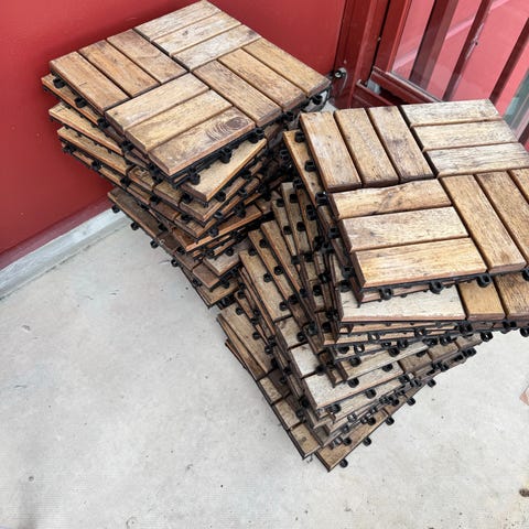 Träklossar räddade från ett terassgolv i akacia eller dylikt regnskogsträ. Storlek 14,5 x 4,5 x 1.