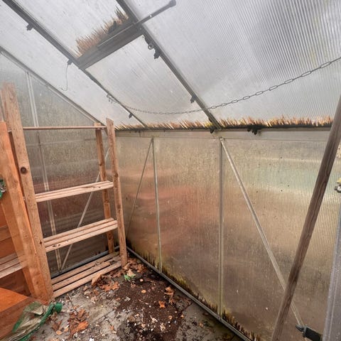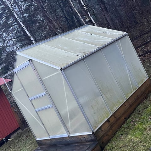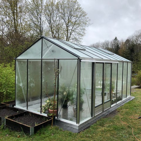 Växthus i aluminium med glaspartier. Klassisk sadeltaksmodell med dörr framtill och fönstersektioner runt om. Passar för odling av växter, förkultivering och förvaring av trädgårdsredskap. Flera glasrutor är skadade eller saknas och behöver ersättas. Växthuset står på en enkel grund av reglar/plattor enligt bild. Price negotiable