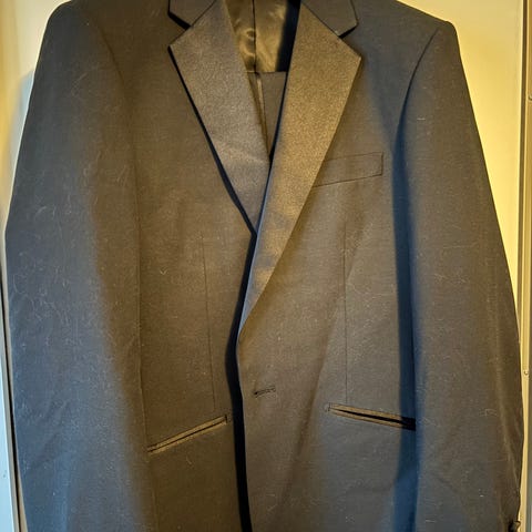 Guess kostym för herr i storlek 52. Tvådelad kostym med kavaj och byxa i grå ull. Kavajen har klassisk krage, flera innerfickor och fodrad insida. Byxorna är raka med pressveck. Materialet är ull, vilket ger ett mer formellt uttryck och passar för exempelvis arbete, högtider och andra tillfällen där en hel kostym önskas.