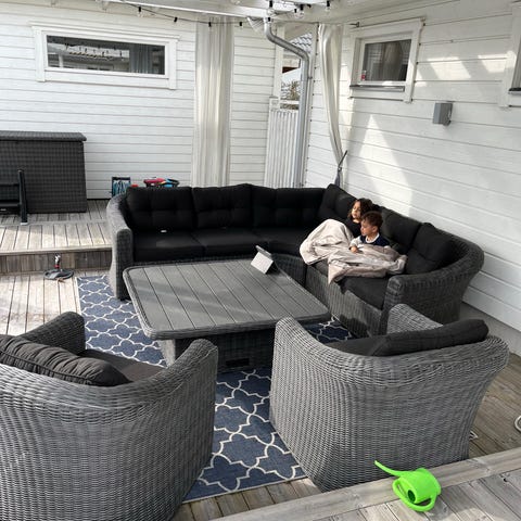 Runt matbord för utomhusbruk med bordsskiva i glas och underrede i svart konstrotting. Bordet är avsett som matbord och kan användas tillsammans med flera stolar, exempelvis på altan, balkong eller uteplats. Glasbordsskivan är rund och vilar på ett stabilt stativ i flätad konstrotting med hyllplan under bordsskivan för extra avställningsyta. Jenny stolar som man kan fälla ner dem är i grå färg .Köpta från Trademax .