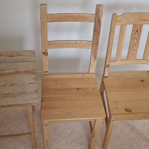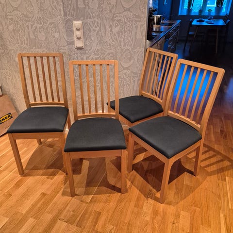 6 st. stolar av märke Grieg. Stolarna är av massiv ek, läder. (något defekt)