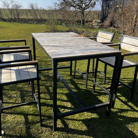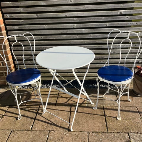 Caféset med ett mindre bord och två stolar i vitmålat Akaciaträ. Både bord och stolar är hopfällbara, vilket underlättar förvaring när de inte används. Passar för uteplats, balkong eller trädgård. Sitsar och ryggstöd är utförda i ribbad trädesign. Setet är avsett för utomhusbruk men kan även användas inomhus vid behov.
