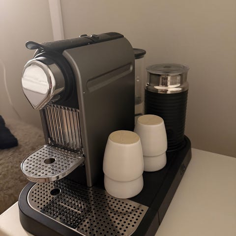 Maskinen använder Nespresso-kapslar och har 19 bars pumptryck för bra smak och crema.
