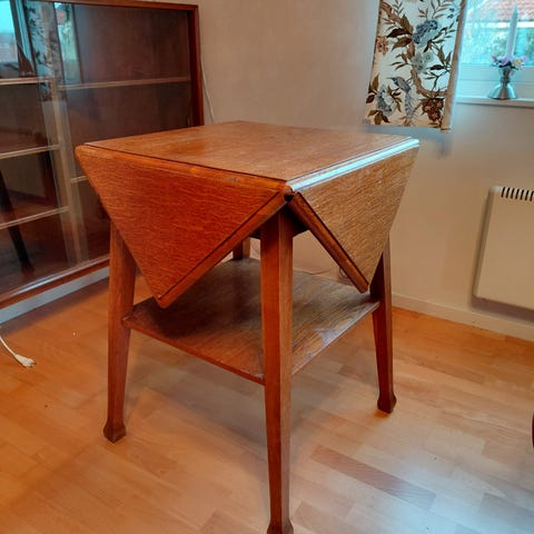 Måtten på bordsytan är 60 x 60 cm som minst, och 80 x 80 cm när flikarna är uppfällda. Bordet är 74 cm högt. Smart konstruktion.