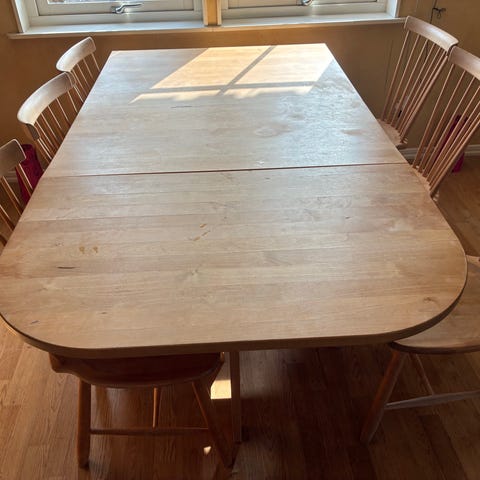 OBS. Bordet är kapat och har tidigare varit längre vilket gör att det ena sidan är tydligt avsågad. Finns repor och märken i bordet, se bilder för detaljer.