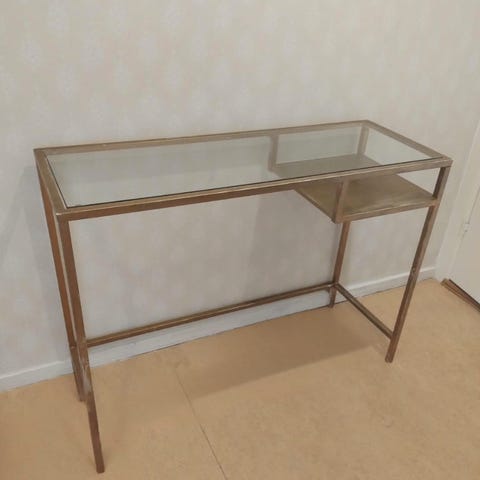 Säljer ett IKEA VITTSJÖ laptopbord som målats om i guldfärg för en mer unik look. Originalet är i metall och glas med en stilren och luftig design.