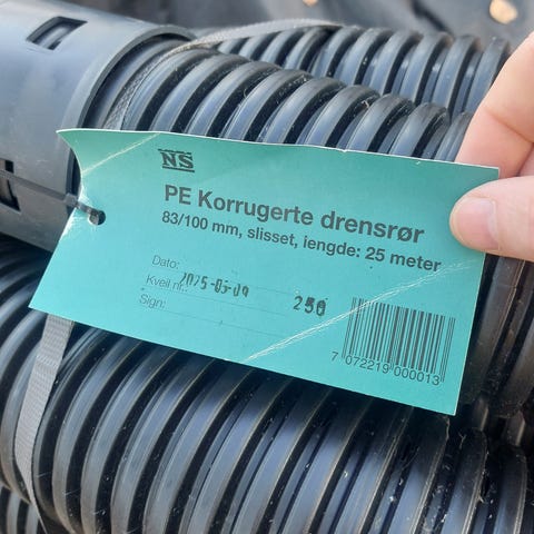 Dubbelväggig dräneringsslang i proffskvalitet 110mm i diameter och 50 m lång. Har fått över efter mitt husbygge.
