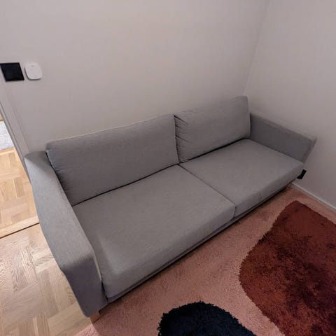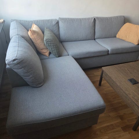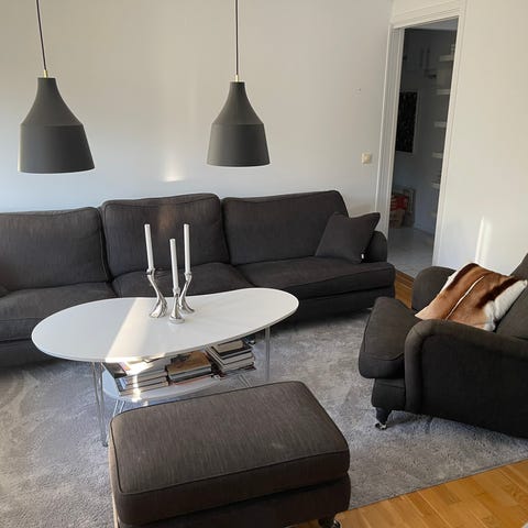 En 4 sits soffa från Mio i gott skick och tillhörande fåtölj + fotpall som kan användas som schäslong till soffan