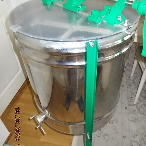 Rostfri foderautomat som rymmer ca 12 liter .