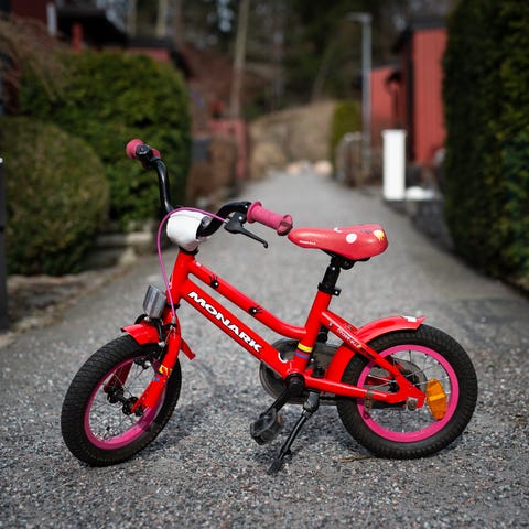 Winther barncykel med 12" hjul i röd färg. Cykeln har låg instegsram, kedjeskydd, pakethållare bak och korg fram. Utrustad med styrstång baktill för att en vuxen ska kunna hjälpa till att styra och skjuta på. Handbroms fram, reflex bak och standardpedaler. Passar mindre barn som ska lära sig cykla eller cyklar kortare sträckor.