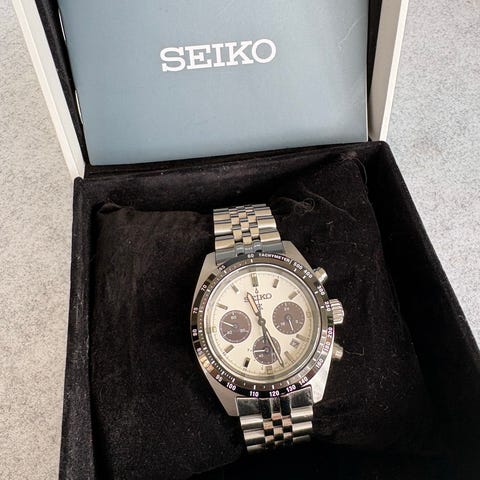 Urtavlan är ljus med mörka subdials och har kronograf-funktion
