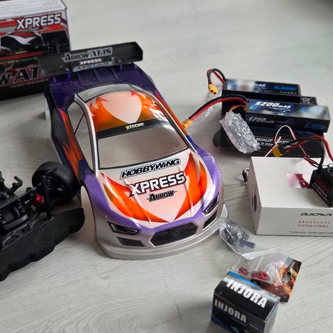 Flera uppsättningar hjul med olika mönster samt adapter för att kunna montera 1:8 däck ingår, samt diverse reservdelar och tillbehör som visas på bilderna. Medföljer laddpåse, laddare och 3 styck lipo batterier varav ett batteri är helt oanvänt ( 5000 mah 3s).