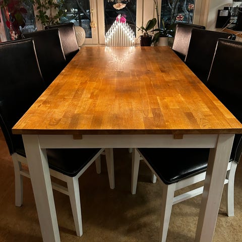 Bord med ekskiva, 240cm lång, 100cm bred + 8 stolar med eksits + skänk med ekskiva, 130 cm lång, 44 cm bred