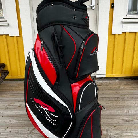 Nike golfbag i röd och svart färg. Väskan har flera fack och fickor för klubbor, bollar och tillbehör. Passar för användning på golfvagn. Bagen är i mycket fint skick.