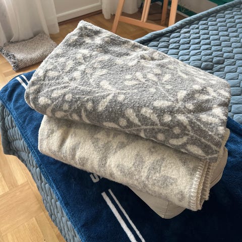 Bönemattor och miniatyr av Kaaba och klockan. Två av bönemattorna är helt nya, den blå är använd men i mycket fint skick.