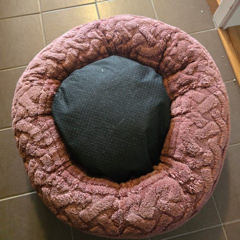 Rund kattsäng i mjuk plysch med grå utsida och rosa insida.