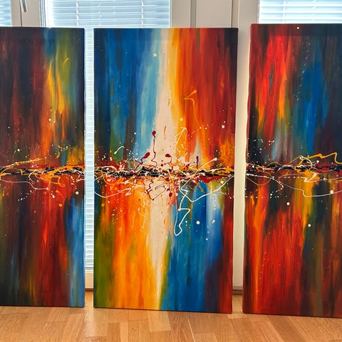 2 st retro färgstarka oljemålningar ena sign L R 69 den andra osignerad storlek 57 cm x 68 cm och 73 cm x 63 cm Ramarna slitna annars ok.
