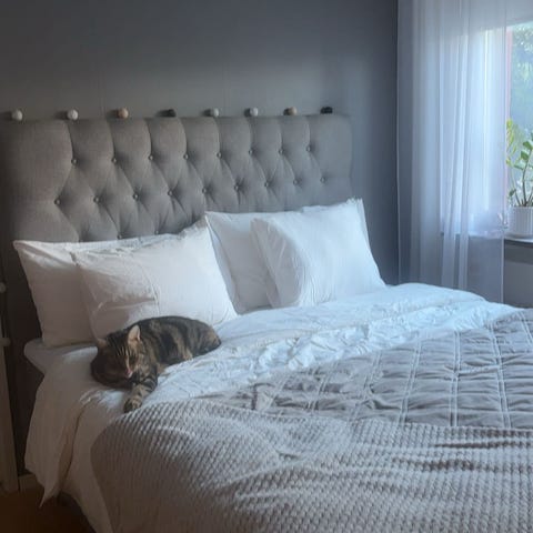 Benvit sänggavel & 2 st sängbord från IKEA. (glömt namnet)