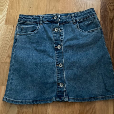 H&M kjol för barn i storlek 164 för flicka. Kjolen är grön och tillverkad i 100 % bomull. Modellen är halv kort med cargofickor på sidorna, bälteshällor i midjan samt knapp- och dragkedjestängning fram. Passar vardagsbruk och fritidsaktiviteter.