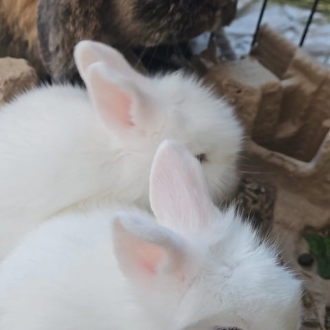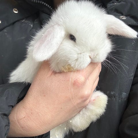 Ungen växer upp i en lugn hemmamiljö där de vänjs vid människor, ljud och hantering dagligen. Den äter hö, pellets och lite grönsaker, och är van vid att bli klappade och lyfta försiktigt.