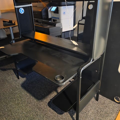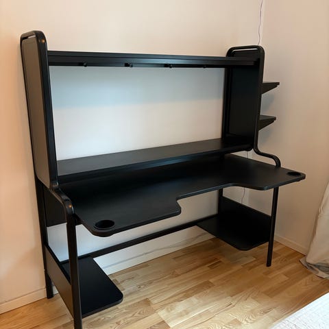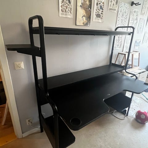 IKEA Fredde skrivbord komplett med samtliga hyllplan. Saknas skruvar till några av hyllplanen (se bild) samt modifierat med två borrade hål för montering av skärmarm/skärmarmar. Finns rester av tejp från ledlister.