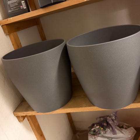 Två höga utekrukor i grå färg. Cylindrisk, något konisk form med bred öppning upptill. Passar för plantering av exempelvis mindre träd, buskar eller större sommarblommor på altan, balkong eller vid entré. Materialet är hårt och tåligt, lämpligt för utomhusbruk. Mått enligt bilder med måttband, med en större och en något mindre kruka i samma stil.