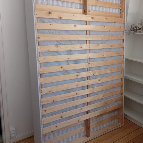 Medelhård säng. Lite fläckig bäddmadrass men i övrigt fint skick. Huvudgaveln finns också till försäljning, vid intresse.