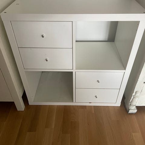 Vit färg. Kan fällas ihop till en byrå. 78 cm bred, 54 cm djup ihopfälld och 79 cm utfälld. Fler mått och beskrivning på Ikeas hemsida. Nypris 2495
