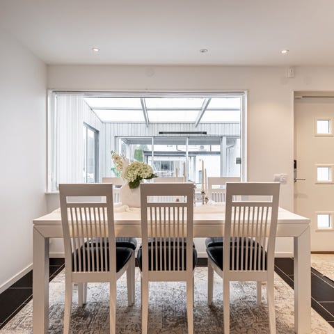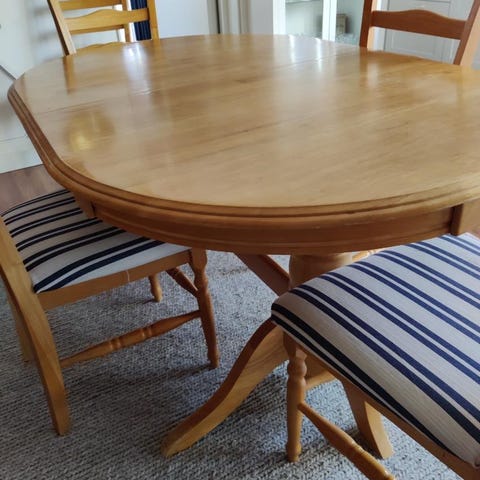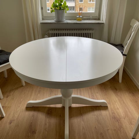 Matbord med 6 st tillhörande stolar samt iläggsskiva. Finns några få märken på bordet.