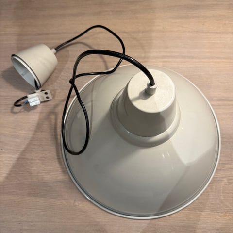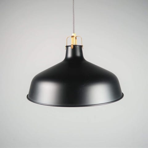 Taklampa från IKEA, modell RANARP. Lampan är vit med detaljer i mässingsfärg och en svartvit textilsladd. Den har en klassisk design som passar i många olika inredningsstilar. Lampan ger ett riktat ljus som är perfekt över ett matbord eller en köksö. Max 11W.