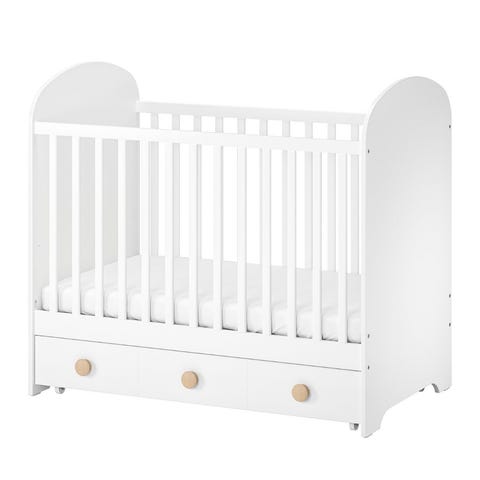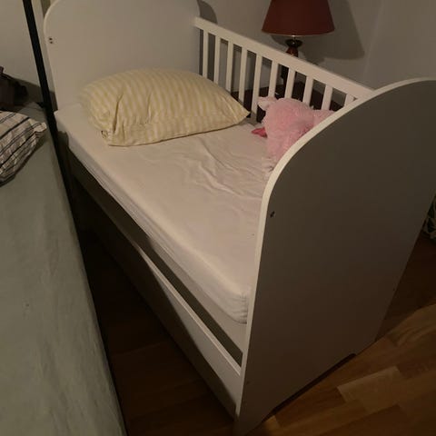 JLY spjälsäng i vit färg med en förvaringslåda. Klassisk spjälsäng med ribbor runt om och plan botten för madrass, (madrass värde 800:- ingår). Samt mobil att hänga ovanför sängen (värde 599:-) ingår. Även två dra-på lakan (oanvända) ingår. Aldrig använd