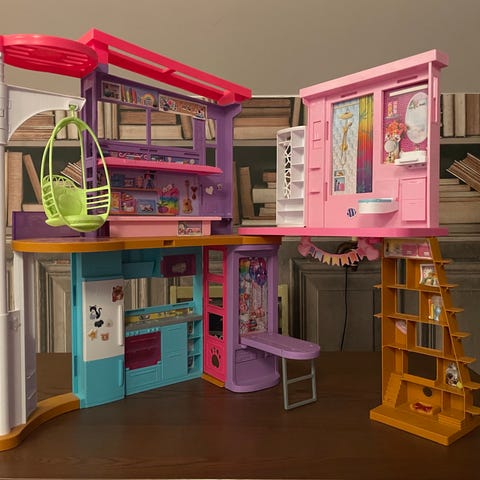 Barbie dockhus med flera våningar, rutschkana och pool. Huset har öppna rum med sovrum, vardagsrum, kök och badrum samt balkong och hiss. Inredningen består av detaljer som soffa, bord, säng, skrivbord och tv. Toaletten kan göra spolljud, på spisen låter tekokaren och många andra roliga detaljer. Dockor och tillbehör ingår!