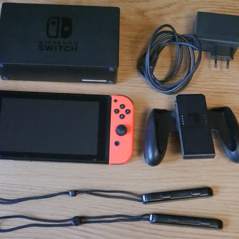 Nintendo Switch spelkonsol med röd och blå Joy-Con, samt den svarta delen där man kan sätta ihop dem.