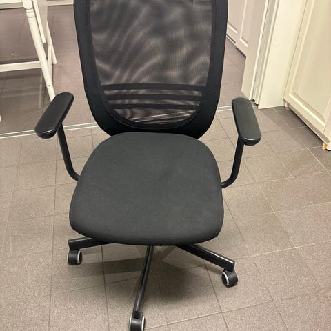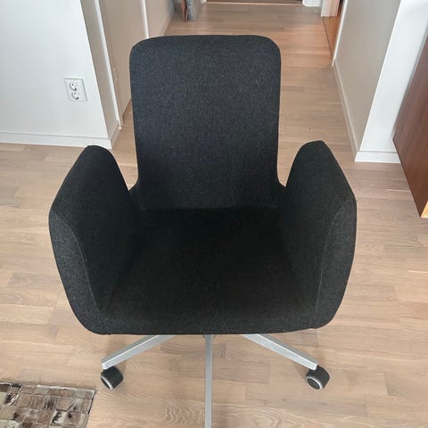 En IKEA kontorsstol av Aage Petersen. Stolen är i svart trä med armstöd och stoppad sits i grått tyg. Underrede i svart metall med hjulkryss och snurrfunktion samt justerbar höjd. Passar som skrivbordsstol eller arbetsstol i hemmakontor eller kontorsmiljö. Färgen har nötts av lite på armstöden vilket syns på 3e och 4e bilden.