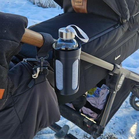 Säljer en mugghållare för barnvagn. Universalfäste så passar på de flesta vagnar. Lätt att klicka loss själva mugghållaren från chassifästet.