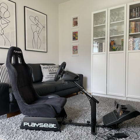 Playseat racingsäte med pedaler i svart färg. Sätet är utformat som en bilstol med låg sittposition och integrerat stativ för ratt och pedalenhet. Pedalerna är placerade på en separat platta längst fram. Passar för bil- och racingspel där användaren vill sitta i en mer realistisk körställning.