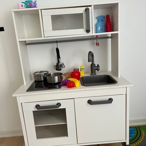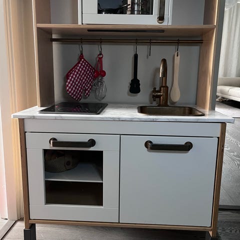 Spraymålat (DIY) vitt IKEA leksakskök med marmorlook, spis och diskho. Köket har två kokplattor, diskho med kran, tillsammans med olika leksakstillbehör som stekpanna, tallrikar och leksaksmat.