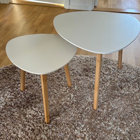 Satsbord i trä. Består av tre rektangulära bord i olika storlekar som kan skjutas in under varandra. Bordsskivorna är i brun träfinish med markerad ram runt kanten. Passar som soffbord, sidobord eller avlastningsbord i vardagsrum eller andra rum där flexibel bordsyta behövs.