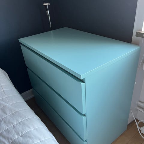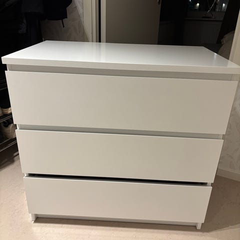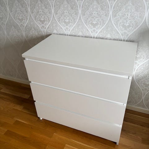 Vit byrå Malm med 3 lådor, bra skick. Hämtas i västra Jakobsberg.