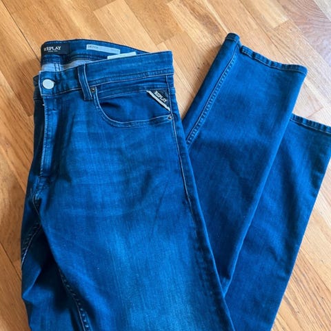Calvin Klein jeans för herr i blå denim. Byxorna är tillverkade i bomull och har midjemått W32. Storlek L. Klassisk femficksmodell med bälteshällor och dragkedjegylf. Passar som vardagsjeans och kan kombineras med t‑shirt, skjorta eller tröja.
