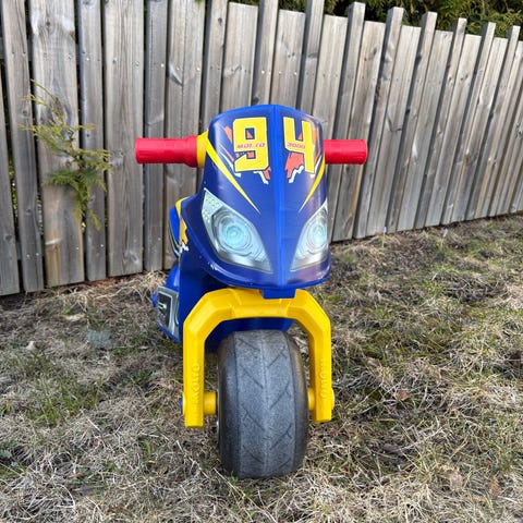 El-fyrhjuling modell utformad som ett litet fordon för barn. Lämplig som leksak för inomhus- eller utomhuslek, med sits och handtag anpassade för mindre barn. Tillverkat i plast med dekaler som detaljering på karossen. Ålder 1,5 - 3 år ca.